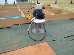 A gauche la pompe à eau à hélice, très peu gourmande en énergie pour faire circuler l’eau dans l’ensemble du système. Au second plan la future plate-forme qui couvrira le bac tampon. A droite la pompe à air qui compressera l’air ambiant pour l’envoyer dans les différents bacs et bassins, ainsi que dans les filtres biologiques.